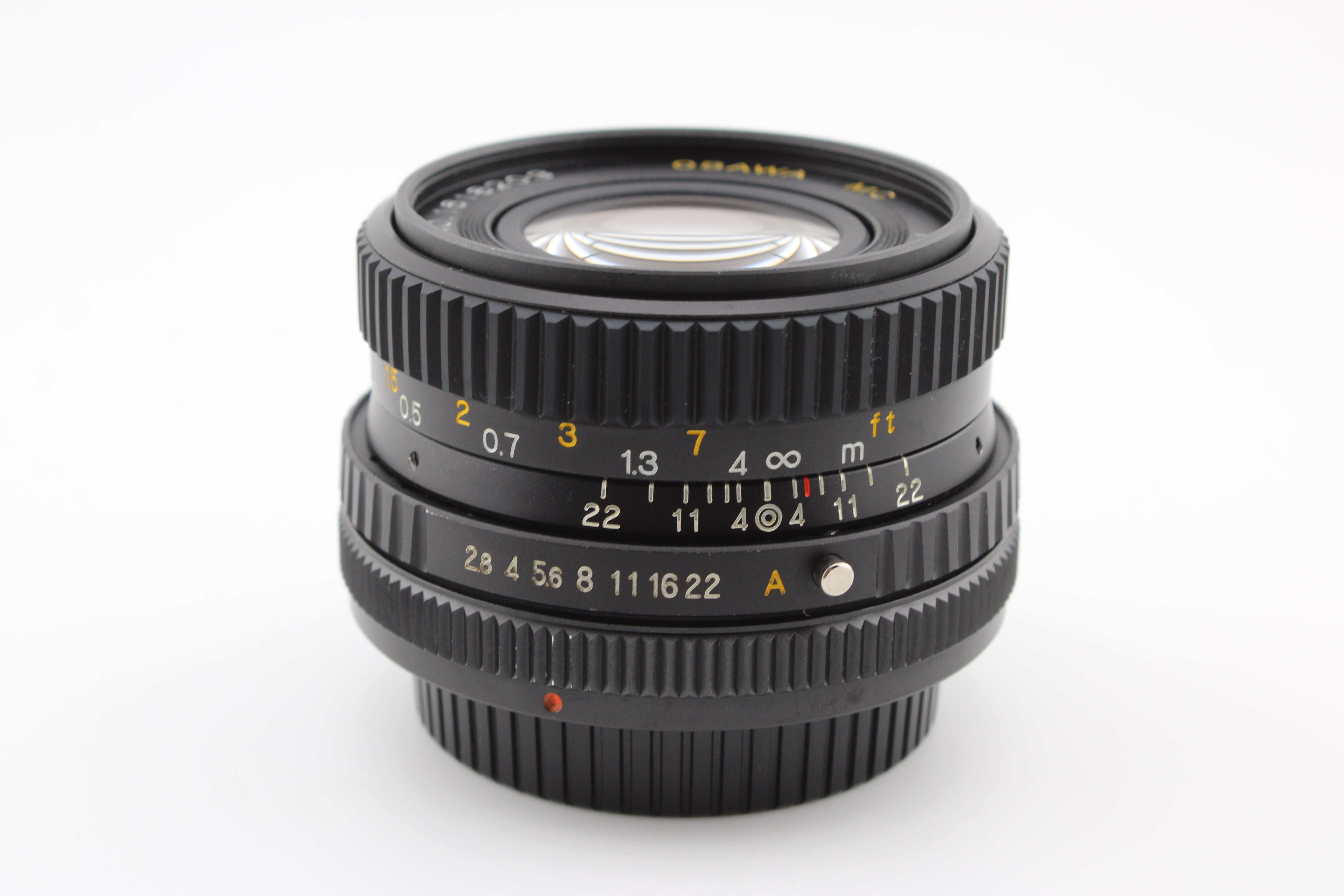 Vérifié avec soin et fonctionnant sans problème. La mise au point de l'objectif est fluide. Les lamelles du diaphragme sont propres. Le verre est en bon état avec de légères rayures et peu de poussière à l'intérieur.
