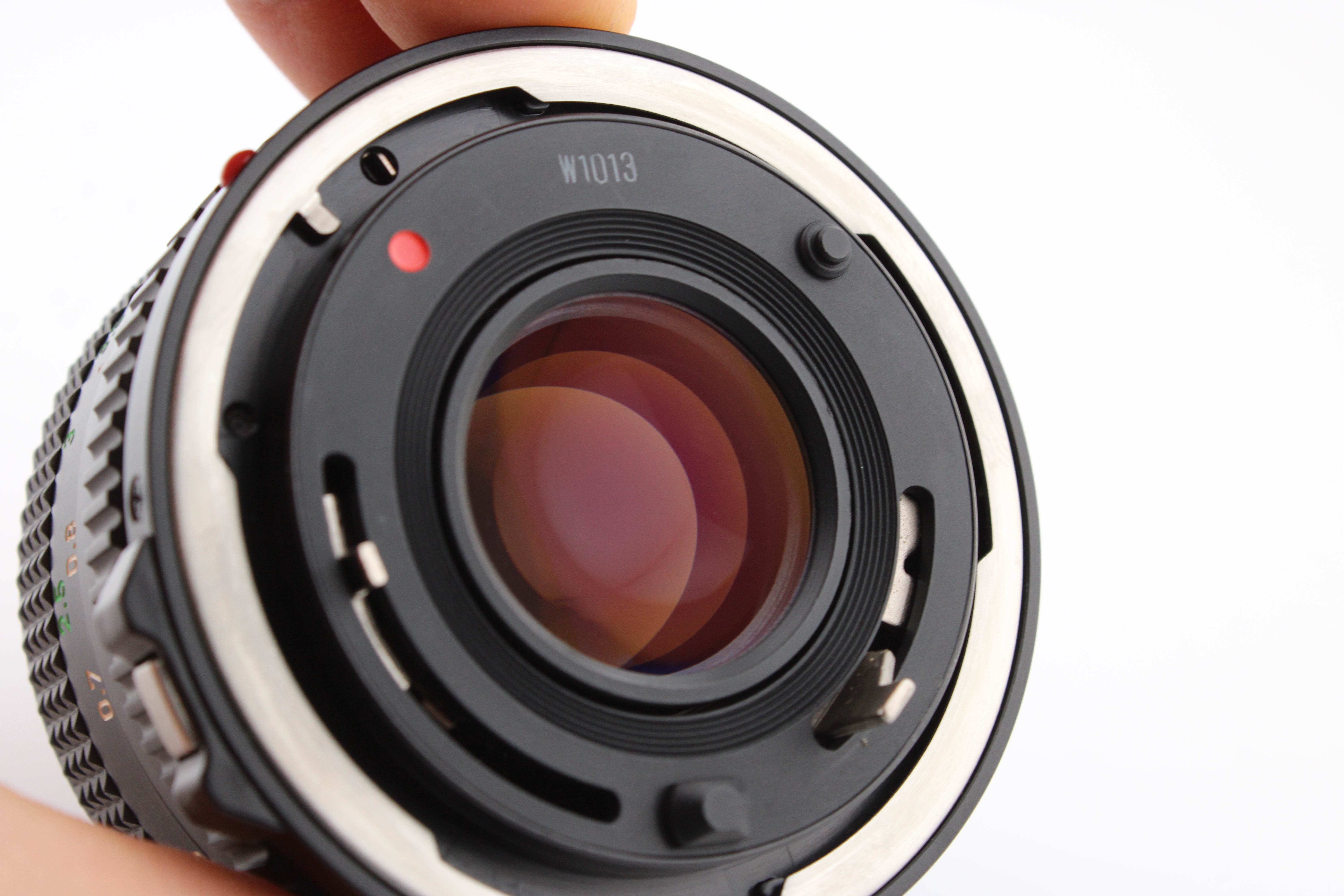 Atidžiai patikrintas ir veikia be problemų. Objektyvo fokusavimas yra sklandus, o diafragmos ašmenys švarūs. Stiklas yra puikios būklės.